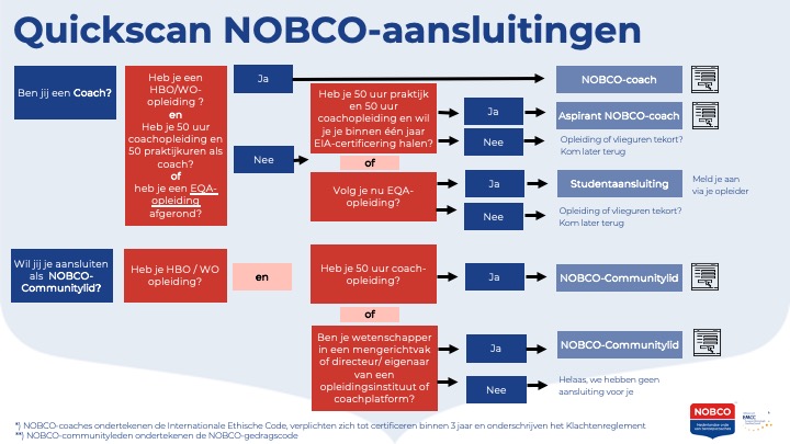 NEE - Als je 50 uur coachopleiding hebt en 50 praktijkuren ben je van harte welkom om je aan te melden bij NOBCO.