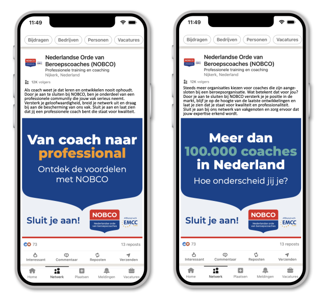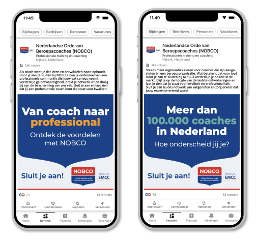 Afgelopen maandag is onze LinkedIn campagne ‘Sluit je aan!’ gestart. We benadrukken met deze social media campagne de voordelen van een aansluiting bij NOBCO. Het doel is om coaches bewust te maken van het belang van aansluiting bij een professionele organisatie als NOBCO. We richten ons tot álle coaches in Nederland, zowel beginnend als ervaren. Coaches die nog niet zijn aangesloten bij NOBCO en ook coaches die op zoek zijn naar professionele ontwikkeling en netwerkuitbreiding. We hebben voor deze campagne de rode loper uitgelegd voor de aanmeldingen, uiteraard met de geldende toelatingsvoorwaarden.