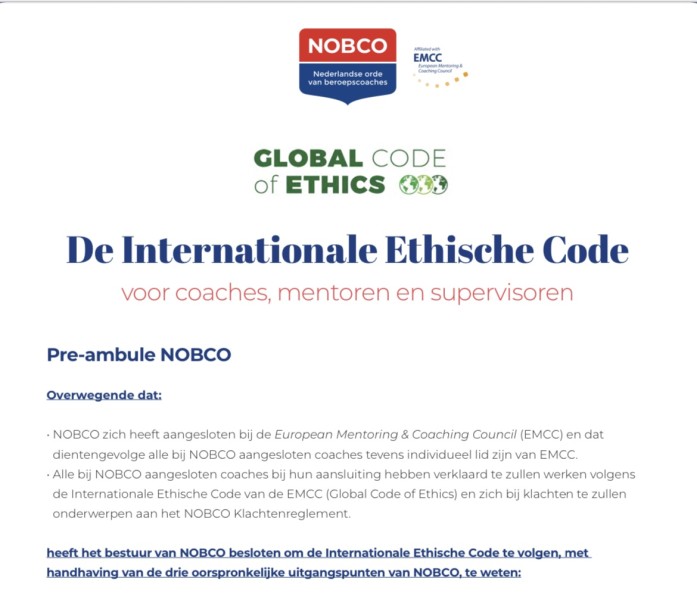 Coaches die aangesloten zijn bij de gerenommeerde beroepsverenigingen op het gebied van coaching, dat zijn er in totaal 10.000, hebben getekend voor de ethische gedragscode. Hierin staat onder meer dat je als coach de grenzen van het vak respecteert en doorverwijst als dat van toepassing is. Er is een onafhankelijk klachtenorgaan, waar klachten over coaches ingediend kunnen worden en een onafhankelijke Commissie van Beroep ingeschakeld wordt. Voor NOBCO geldt dat we het internationale keurmerk van EMCC Global voeren, waarin voortdurende reflectie en professionele ontwikkeling wordt gevraagd van de coaches. Wij moedigen particulieren en organisaties van harte aan om een coach te kiezen die aangesloten is bij de beroepsorganisatie en ons te helpen deze professionele standaard met elkaar te bewaken.